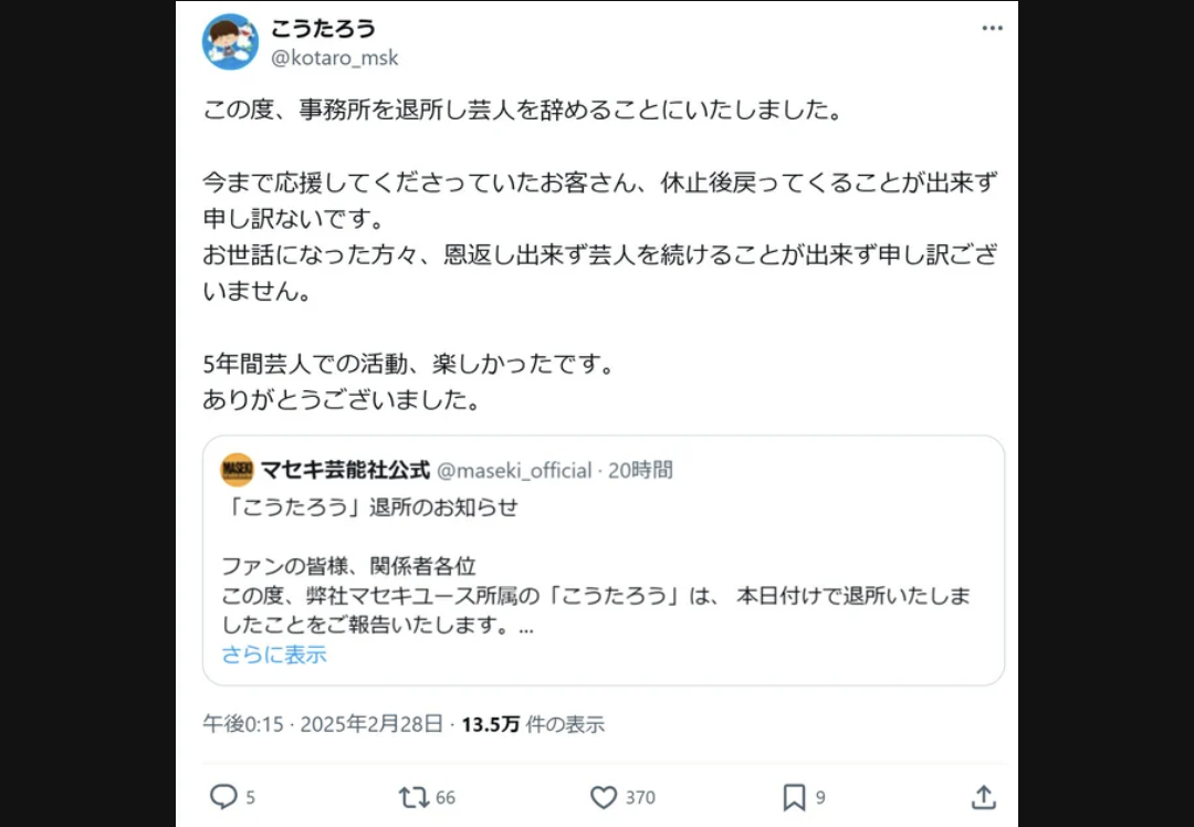 【【衝撃】23歳ピン芸人さん、突然の「引退」発表!!?】の続きを読む